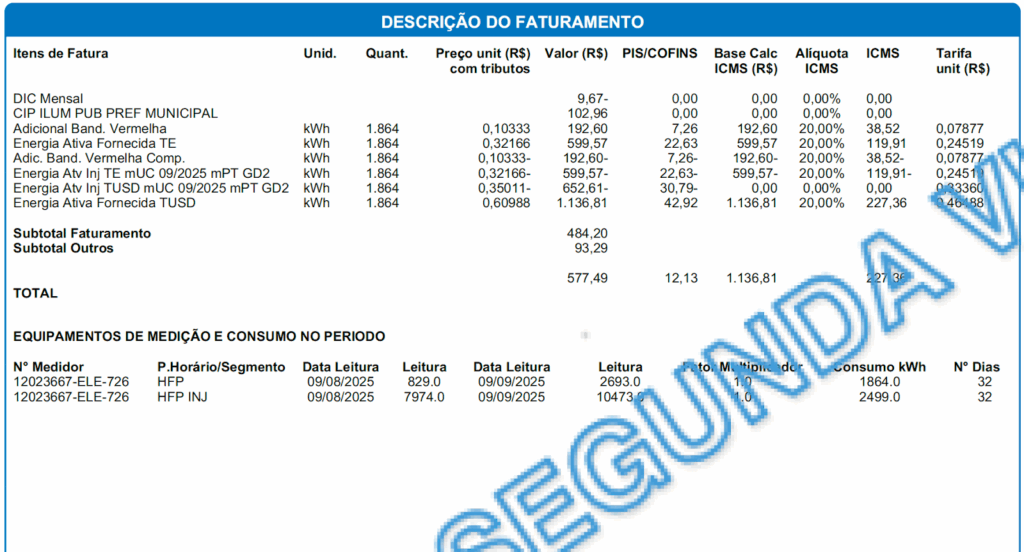 Ainda assim, houve cobrança de CIP, ICMS, bandeira tarifária e parcela do Fio B, que é a parte da TUSD não compensada.
