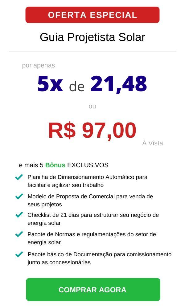 O Guia Projetista Solar é um material digital no formato de pdf e será enviado para você um e-mail com os dados para o acesso do material e download imediatamente após a confirmação do seu pagamento.