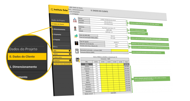 Inserir informações da conta do seu cliente, média de consumo e os dados básicos do Projeto.