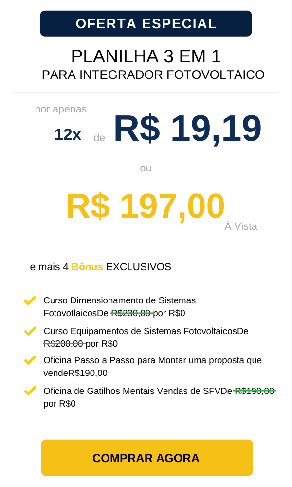O Passo a Passo para dimensionar Sistemas Fotovoltaicos de Forma Simples, prática e Segura. Sempre que tiver alguma dúvida sobre seu dimensionamento na Planilha você poderá assistir essas aulas para confirmar se tudo está sendo dimensionado como manda a Norma.